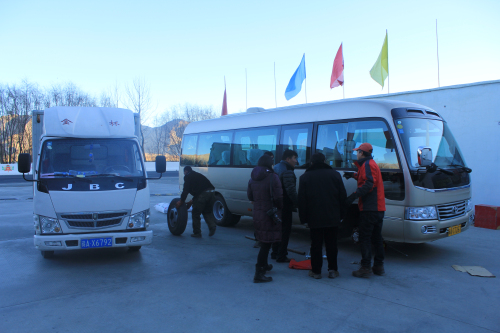 19日清晨7時,滿載物資的貨車本應準時從拉薩市出發,前往日喀則目的地,但剛準備出發,我們的貨車卻因天氣寒冷,在香格里拉酒店的坡道上熄火。天氣太冷,發動機打不著火,這可急壞了大家伙,當下,大家紛紛下車,一起推車。所幸,最終貨車重新啟動!可在汽車行駛至拉薩機場附近時,我們的客車又被利物刺破了前輪,并且由于天色尚早,附近的幾處修理廠皆是大門緊閉,尚未開門,好在加油站的工作人員替我們打了電話,找來了一位修車師傅!