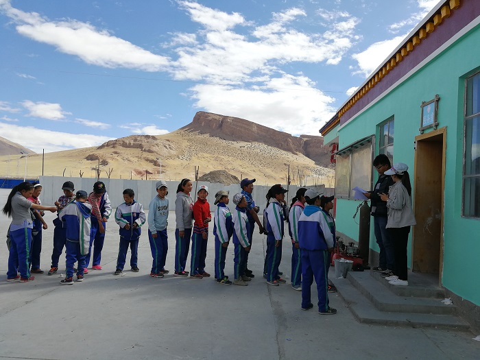 我跟隨劉冬梅醫生組前往革吉縣初級中學進行篩查工作,學生們在班主任的帶領下,排著整齊的隊伍,填寫資料、做B超、抽血留樣,秩序井然。