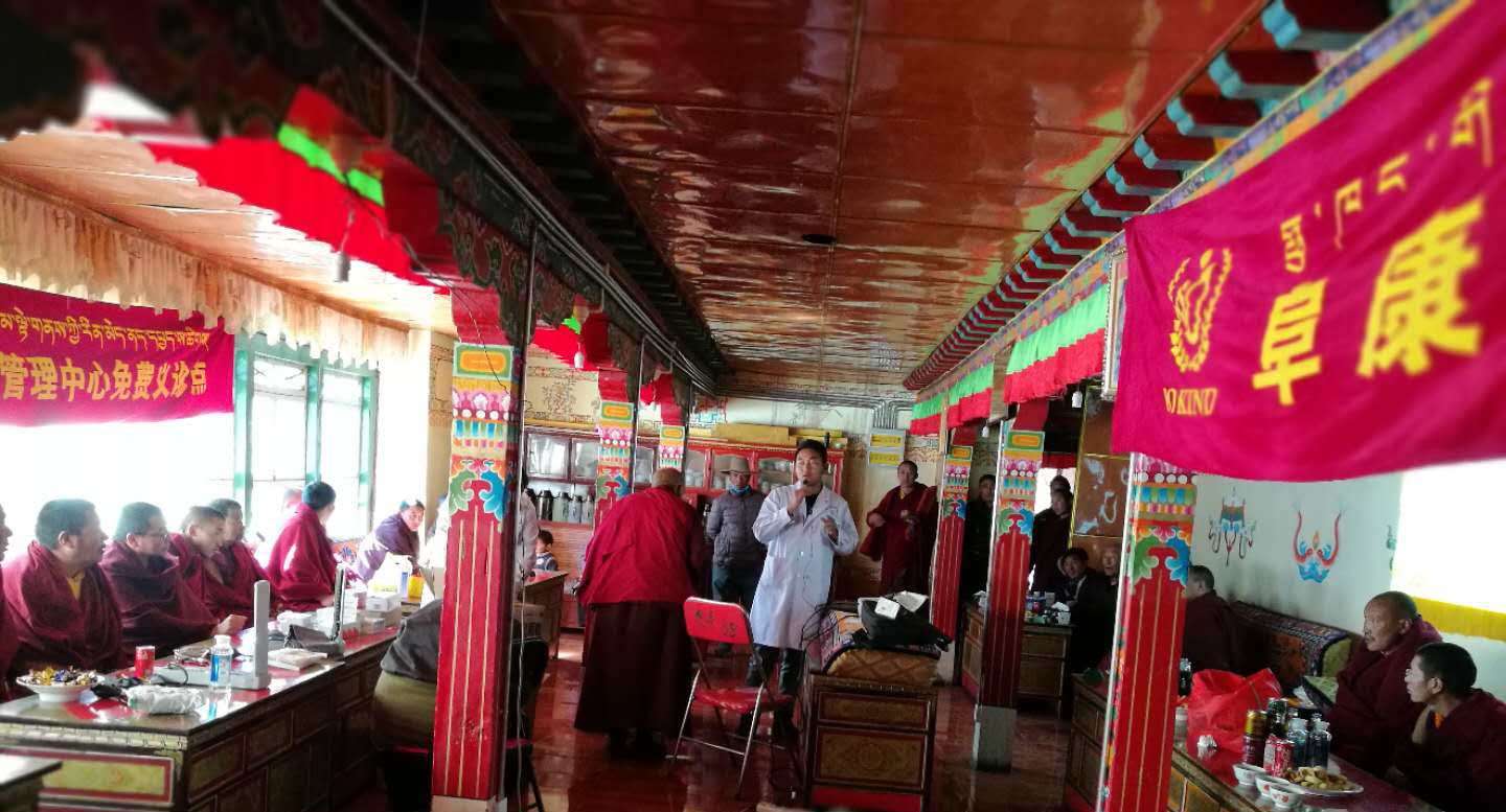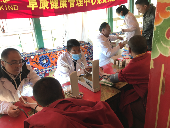 隨后,義診活動井然有序地開始了,張院長和田豐輝醫生負責測血壓,護士唐宗青測血糖,瓊瑪負責發放藥品,占堆(我院體檢中心醫務人員)對每一位血壓、血糖高的僧人、群眾進行登記,有利于以后對他們的健康進行隨訪跟蹤,了解他們有無不適以及血壓、血糖情況,督促他們的按時服藥、并指導他們健康的生活方式。在義診體檢過程中,一名76歲的老人,血壓200/120mmHg,經過詢問,老人身體并沒有不適,在詳細的給老人講解了高血壓對身體健康的影響,以及高血壓帶來的危害后,并給予老人免費發了治療高血壓的藥物,囑咐他這幾天要每天規律服用降壓藥物、監測血壓,直至血壓在正常范圍后可以改為三到五天測一次血壓,但降血壓藥物不能停止,老人欣然接受意見,并握手致謝。