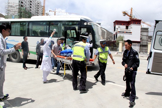 “我公司旅游車藏AL0887去機場途中,在柳梧村附近發生側翻,有乘客受傷,請求支援。”隨著模擬報警電話響起,此次應急演練正式開始。旅游公司、110、120分別接到報警電話后,迅速趕往“事故現場”進行救援,同時,西藏旅游汽車公司也立即啟動應急預案。