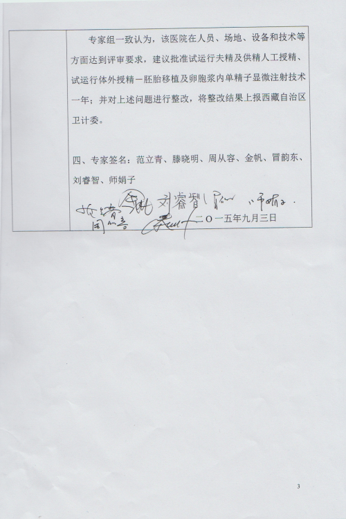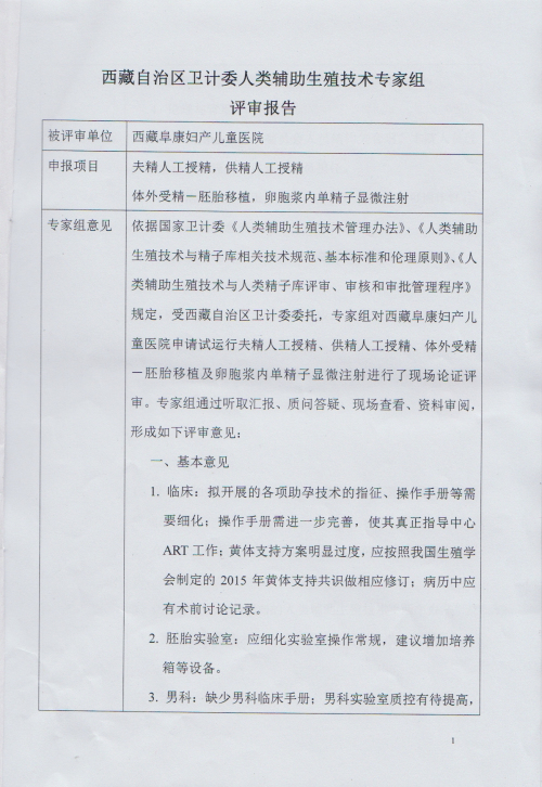 你公司提交的開展人類輔助生殖技術(shù)申請,經(jīng)錄入國家輔助生殖技術(shù)管理信息審核通過后,系統(tǒng)遴選了7名專家,于2015年9月3日到拉薩市進(jìn)行實(shí)地審核評審。按照專家組提交的評審報告意見,同意你公司在西藏阜康婦產(chǎn)兒童醫(yī)院(拉薩市羅布林卡路18號),試運(yùn)行開展精子人工受精、供精人工受精、體外受精-胚胎移植、卵胞漿內(nèi)單精子顯微注射四種人類輔助生殖技術(shù),試運(yùn)行時間一年。