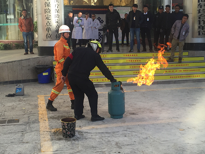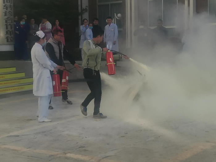第二部分在我院住院區大院內,消防隊員進行了現場演示,講解了如何使用滅火器,并現場點燃了一堆火,使用滅火器將大火撲滅,以直觀的方式,告訴醫護人員如何使用滅火器材;我院員工也派出后勤、臨床代表參加了演練。