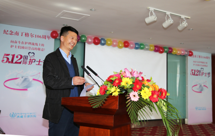 王斌董事長致辭,他代表西藏阜康醫療股份有限公司全體股東向工作在一線的護理工作者表示深深的謝意,同時感謝一直支持他們的家人和親友,王斌董事長表示他一定會竭盡所能帶領醫院領導班子為我院護士們創造一個更好的工作環境和更加滿意的福利待遇。