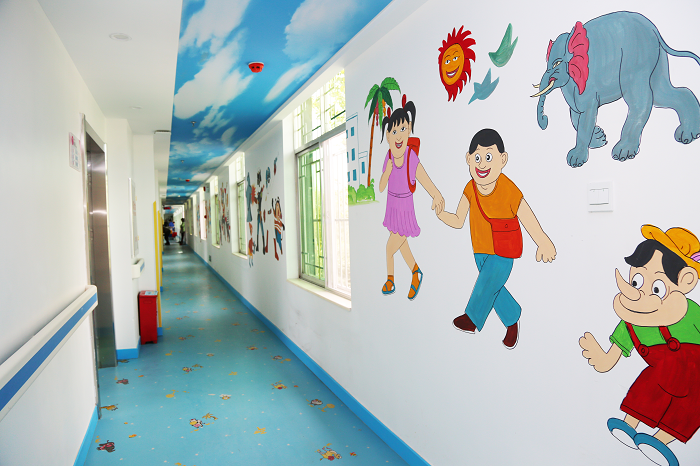 近日,隨著醫院的改造升級,兒科病房一改往日單調刻板的面貌,變身童趣十足的游樂園。整個科室以兒童喜愛的鮮亮色彩作為主色調,并增添了許多人性化設計,將原來白色墻面豐富為彩色亮麗、充滿童趣的墻體,走廊處畫上了各類卡通圖案,營造了溫馨可愛的氛圍,小朋友們就診時如同置身于卡通樂園,充分體現了現代化專科醫院室內設計的人文理念。