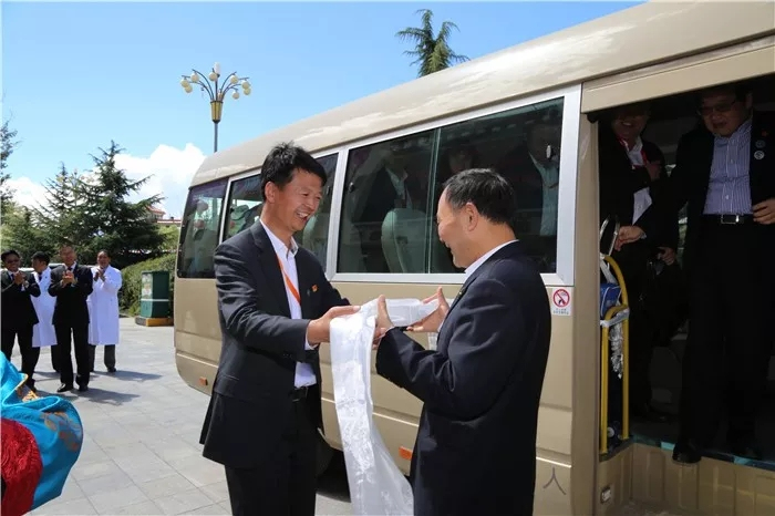 西藏阜康醫療股份有限公司黨委書記、董事長王斌同志為蒞臨阜康醫院考察指導的領導獻上哈達