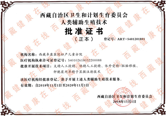 近日,西藏自治區衛生和計劃生育委員會正式下發文件,確認由西藏阜康醫院婦產兒童分院生殖醫學中心開展的常規體外受精-胚胎移植(IVF-ET)技術、卵胞漿內單精子顯微注射(ICSI)技術、夫精人工授精(AIH)及供精人工授精(AID)技術,四項人類輔助生殖技術校驗合格,同意該中心作為西藏目前開展人類輔助生殖技術中心繼續開展相關技術的單位。