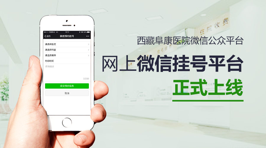 昨日,記者從西藏阜康醫院獲得好消息:5月24日,西藏阜康醫院微信公眾平臺網上預約掛號系統正式上線,可提供微信掛號、在線問診、健康咨詢、新聞動態等服務。