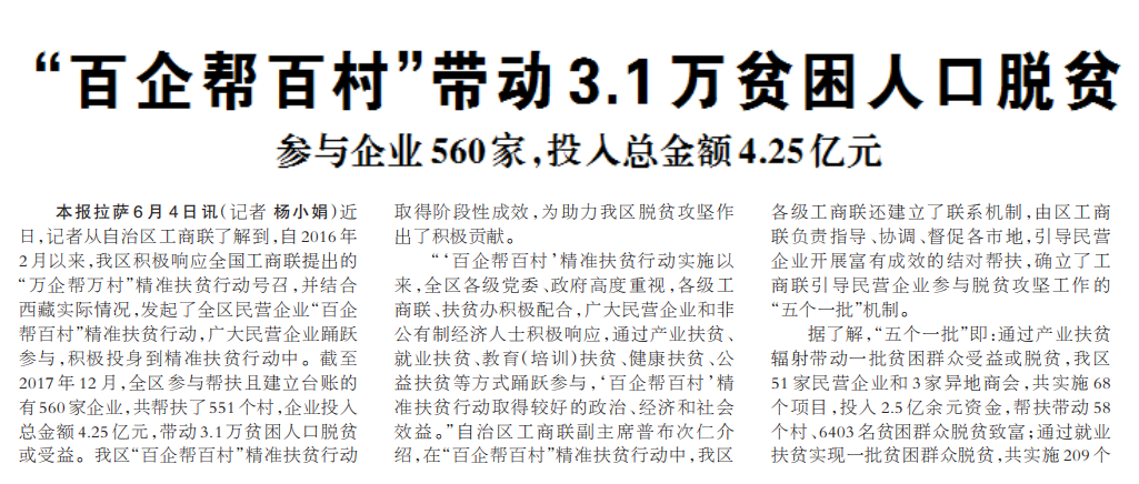 本報拉薩6月4日訊(記者 楊小娟)近日,記者從自治區(qū)工商聯(lián)了解到,自2016年2月以來,我區(qū)積極響應(yīng)全國工商聯(lián)提出的“萬企幫萬村”精準(zhǔn)扶貧行動號召,并結(jié)合西藏實際情況,發(fā)起了全區(qū)民營企業(yè)“百企幫百村”精準(zhǔn)扶貧行動,廣大民營企業(yè)踴躍參與,積極投身到精準(zhǔn)扶貧行動中。截至2017年12月,全區(qū)參與幫扶且建立臺賬的有560家企業(yè),共幫扶了551個村,企業(yè)投入總金額4.25億元,帶動3.1萬貧困人口脫貧或受益。我區(qū)“百企幫百村”精準(zhǔn)扶貧行動取得階段性成效,為助力我區(qū)脫貧攻堅作出了積極貢獻。
