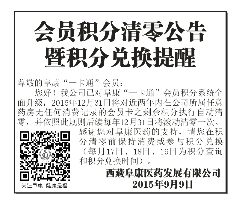 您好!我公司已對阜康“一卡通”會員積分系統(tǒng)全面升級,2015年12月31日將對近兩年內(nèi)在公司所屬任意藥房無任何消費(fèi)記錄的會員卡之剩余積分執(zhí)行自動清零,并依照此規(guī)則后續(xù)每年12月31日將滾動清零一次。感謝您對阜康醫(yī)藥的支持,請您在積分清零前保持消費(fèi)或參與積分兌換(每月17日、18日、19日為積分查詢和積分兌換時間)。