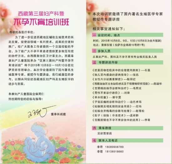 首先,我們代表西藏第三屆婦產科暨不孕不育培訓班會務組熱烈歡迎您前來參加西藏第三屆婦產科暨不孕不育培訓班,會務組全體工作人員將在會議期間竭誠為您提供全方位的生活、會務服務。為了您在會議期間的生活、工作和參加會議的方便、愉快,請您仔細閱讀并注意以下事項: