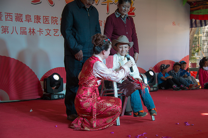 看藏裝典雅,賞舞姿婀娜。在三位主持人熱情洋溢的主持下,一曲優(yōu)雅典美的藏舞《芒康弦子》正式拉開了本次林卡文藝匯演的帷幕,也再度點燃了大家的林卡情懷!隨后,由醫(yī)院各科室員工帶來的諸如藏語歌曲演唱、小提琴演奏、架子鼓演奏、吉他演奏、古箏演奏、軍禮表演、現(xiàn)代舞蹈、獨舞、歌唱、小品、相聲、T臺秀、大合唱等一系列精彩紛呈的節(jié)目應(yīng)接不暇地呈現(xiàn)在大家眼前,讓現(xiàn)場觀眾為之歡呼雀躍,好不開懷。同時,在本次的林卡文藝匯演中,還有一個十分特殊的節(jié)目——一個名為塔巴次仁的藏族小男孩及其家屬為我們?nèi)w阜康工作人員寫來一封感謝信,并在林卡演出現(xiàn)場為大家演唱了一首《感恩的心》。