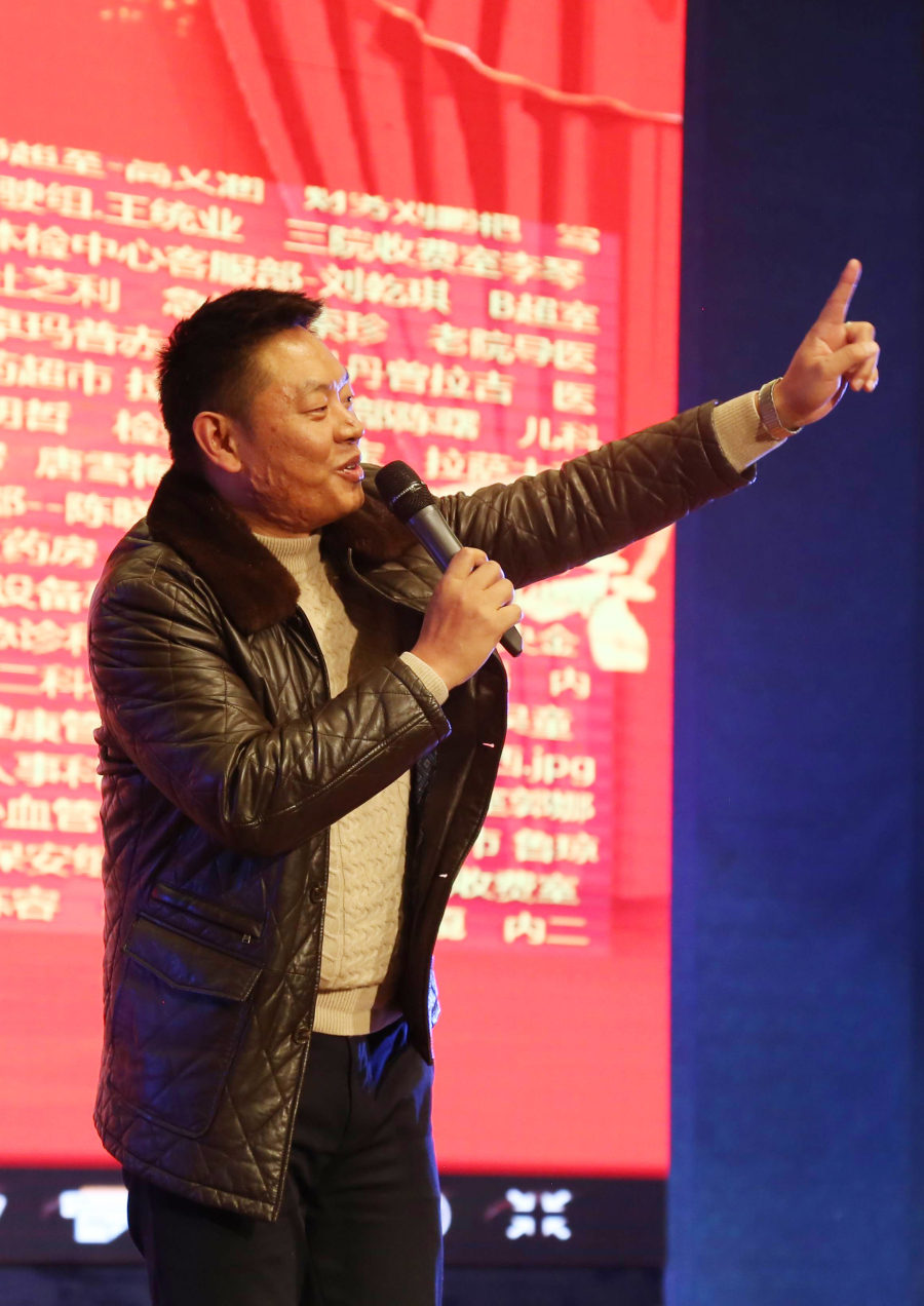隨后,董事長王斌走上講臺飽含激情地說“我之存在,因為有你”,并向所有來賓鞠躬致謝。董事長王斌講述了阜康發展史、阜康人的奮斗史,從2005年的47名員工到現在的1024名員工,并再次感謝一路伴隨阜康成長的所有人,還指出2018年是阜康發展史上很關鍵的一年,要早計劃、早安排、早部署,要以十九大精神為指導,堅持科學發展觀,早日把阜康建設成為現代化醫院。
